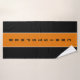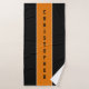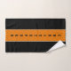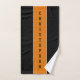 Conjunto de toalhas preto clássico com duas listras brancas finas e uma faixa laranja vertical larga no centro com nome personalizado nele.