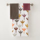 Este conjunto de toalhas tem um pano de lavagem de ouro rosa, uma toalha de mão de platina, e uma toalha de banho com um design de Boho de três folhas, juntamente com três pontos abaixo delas em prata, ouro, latão, platina e ouro rosa.