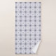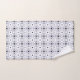 Two images showing a matching towel and washcloth set with a blue geometric pattern on a white background. The towel hangs on a silver rod, and the washcloth is folded with one corner turned up, showcasing its design."