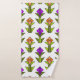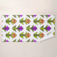 Este conjunto de toalhas tem um pano de lavagem laranja, uma toalha de mão roxa, e uma toalha de banho com um design de deco artístico feito de diamantes, triângulos, e tulipas de fazer de polígonos em laranja e roxo com caules e folhas verdes.