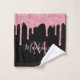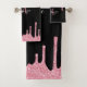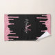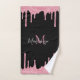Trendy Pink Rose Dourada Glitter Sparkle Drips Bath Towel Set com seu nome personalizado e monograma em um fundo de pingos cintilantes cintilantes em um fundo preto quico. Perfeito para a sua estética de brilho. Projetado por Cedar e String. Se precisar de assistência ou itens correspondentes, entre em contato conosco em cedarandstring@gmail.com