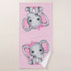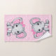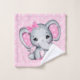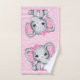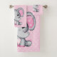 Conjunto de toalhas com uma ilustração de aquarelas de elefante rosa giro. Ela tem orelhas bonitinhas, cor-de-rosa e bolinhas branca e arco bonito de fita rosa sobre a cabeça. O plano de fundo é rosa claro com bolinhas coloridas creme.