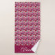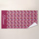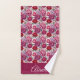 Rosas vermelhas, colônias cor-de-rosa e lilases roxas em um fundo branco criam um belo conjunto de toalhas de banho com um olhar antigo. Um bar de cor sólida no fundo, em uma sombra vermelha complementar, tem espaço para personalizar com seu nome.