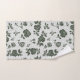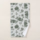 Duas toalhas estampadas são exibidas com um desenho floral. A imagem superior mostra uma toalha pendurada em uma haste, enquanto a inferior mostra uma toalha de rosto com uma quina virada.