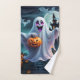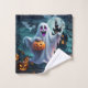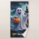 Encantando a design de Halloween. Pequeno fantasma amigável na noite escura e mística. O fantasma tem um branco suave e brilhante e veste um sorriso malicioso que cria uma atmosfera acolhedora. À sua volta, pequenas estrelas brilham no céu e a lua brilha em tom suave. Bombas lançam sombras suaves no chão, dando ao design um humor quente e automático.