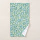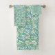 Este conjunto de toalhas tem uma design de Boho de espirais sobrepostas em azul e verde num campo de branco.