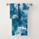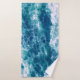Design de fantasia azul colorido, verde-marinho, verde-lacre e abstrato branco de ondas do mar com espuma.