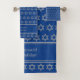 Na moda Israelita azul STAR OF DAVID Bath Towel Set, mostrando a estrela prateada falsa de David em um padrão ondulado. O texto diz FELIZ HOLIDAY CHAG SAMEACH e é PERSONALIZÁVEL para que você possa substituí-lo por um nome, saudação ou texto hebraico. Isso daria um presente ideal para Chanucá, Rosh Hashanah, Natal, Aniversários, e ao longo do ano. Vem em outras cores.