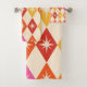 Este é um belo Meio século de rajadas modernas em diamantes de harlequin retrorados em laranja, vermelho, amarelo e rosa sobre fundo bege. É excelente decorativo para o seu banheiro como toalhas de banho