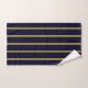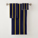 Um moderno conjunto de toalhas de banho listradas azul e amarela.