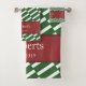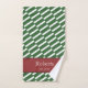 Adicione um toque de design único funky à decoração do banheiro doméstico com este conjunto de toalhas de banho personalizado. Este conjunto de toalhas moderno tem um padrão de fundo de listras verdes e brancas e uma área vermelha para o seu sobrenome familiar e a data em que a sua família foi estabelecida (ou texto da sua escolha). Este conjunto de toalhas faz um presente personalizado de excelente para um lar, chá de panela, aniversário ou casamento, e é excelente para todos os casais e famílias.