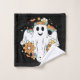 Conjunto de toalhas com uma ilustração de um fantasma sorridente. Decorado com flores, arco-íris e morcegos.