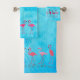 Toalha de banho rosa com flamingos colocada em design de água azul. Perfeito para uma casa de praia, ou condomínio de férias, nos trópicos. Comprar separadamente ou como um conjunto.