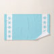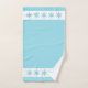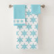 Bonito toalha do banheiro de inverno, com a toalha de banho feita em branco com um padrão de flocos de neve azul turquesa com gráficos de diamantes. A toalha da mão é feita em azul-turquesa, com uma banda de flocos de neve brancos e brancos correndo sobre ela, e o pano de lavagem é um azul-turquesa sólido. Personalize para adicionar qualquer texto que você quiser.