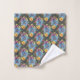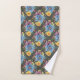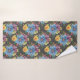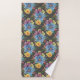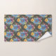 O design com toalha de banho bonito tem grandes flores azuis primárias pintadas com flores menores em amarelo-marigold, roxo e rosa, tudo sobre uma cinza de carvão que lhe dá um aspecto escuro e elegante.