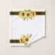 Estas toalhas de girassol são lindas e dramáticas. A toalha de banho é preta, transformando-se em branco, com grandes e elegantes girassóis em cada extremidade. O pano de lavagem é branco com uma borda preta e amarela e um buquê de girassóis amarelos. A toalha da mão é preta a esbranquiçada e personalizada com uma inicial de monograma.