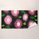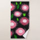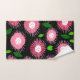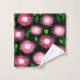 Este conjunto de toalhas tem um design escandinavo de flores minimalistas em tons de rosa e folhas em tons de verde em um campo de preto.