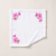 Gérnios rosas claro com pétalas esboçadas em magenta. O pano de lavar tem imagem de solteiro em cada canto. A toalha da mão tem três imagens em uma linha em cada extremidade. A toalha de banho tem a imagem de solteiro pequeno replicada em linhas diagonais.