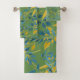 Um belo padrão mostra ramos de folhas em blues e douradas sobre fundo verde, complementando uma variedade de temas de decoração caseira do século médio ao moderno.