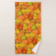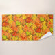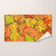 Padrão de blocos sem costura de folhas estilizadas de queda em castanho, vermelho, laranja, amarelo e verde.