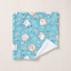 Toalha com um padrão de gato giro, colocada sobre fundo azul e decorada com arco-íris e estampas de pata e muito mais.