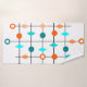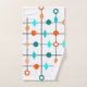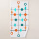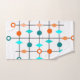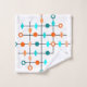 Este conjunto de toalhas tem um design moderno do século médio de uma grade em linhas pretas com círculos laranja e lacrimogêneo e diamantes.