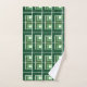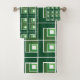 Este conjunto de toalhas tem um design geométrico feito de Ls em tons de verde dispostos em diferentes direções se repetindo na design.
