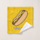 Ilustração de desenho animado de cachorro-quente. Imagem do contorno da comida de lixo ícones de fundo amarelo. Texto personalizado em cada toalha.