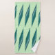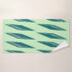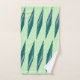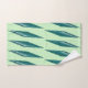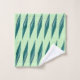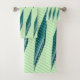 O trabalho de arte de conjunto de toalhas de banho apresenta um padrão de formas de diamante ciano, alongadas, articuladas em forma de gradiente, ilusionário e quadrada tridimensional contra uma canvas verde-chá pastel fresca.