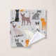Gato branco, gato preto, gato com mesa, gato persa, gato siamês, gato tuxedo com estampas de pata sobre fundo de cor clara.
