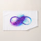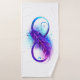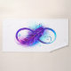 Símbolo infinito com uma bela pena pintada em cores roxas e azuis brilhantes sobre fundo branco.