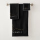Toalhas personalizadas (ou peças individuais) com iniciais simples e elegantes de escrita caligráfica manuscrita ou monograma e nome em ouro e branco contra um fundo preto editável para um olhar de na moda. ALTERAÇÕES: Altere a cor de fundo, escolha um plano de fundo gráfico estilizado ou altere o estilo, a cor, o tamanho e a posição da fonte de texto clicando em EDIT (EDITAR) na seção PERSONALIZE para obter um design personalizado. ASSISTÊNCIA: para obter ajuda com a modificação ou personalização do design, alteração de cor, redimensionamento ou transferência do design para outro produto, entre em contato com o designer ANTES DE ENCOMENDAR através da guia MENSAGEM de Bate-papo Zazzle abaixo ou envie um email para makeitaboutyoustore@gmail.com.