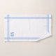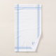 Este elegante conjunto de toalhas brancas apresenta faixas azuis juntamente com iniciais personalizáveis simplesmente colocadas nos cantos.