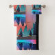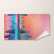 Toalha com um belo design gráfico com um lago pacífico com veado. e pinheiros altos sendo refletidos na água. Estrelas sobrepõem-se.