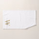 Conjunto de toalhas de banho personalizadas com monograma moderno feminino e elegante em branco e dourado. Apresenta um primeiro nome (ou sobrenome) em uma linda tipografia de letra manuscrita com cauda rebuscada (ou caligrafia) com monograma inicial em dourado e preto sobre fundo branco. Ótimo presente feminino e elegante para aquecimento de casa, também para aniversário, casamento, chá de noiva, despedida de solteira, dia das mães, festa de aniversário de 16 anos, presente de aniversário e para festa de formatura. É para a garota que gosta de coisas elegantes e sofisticadas.