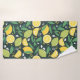 Toalha de mão com um padrão fofo que apresenta limões amarelos e fruta verde de limão com pedúnculos de folhas sobre fundo verde escuro.