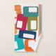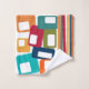 Este conjunto de toalhas tem uma design moderna do século médio de linhas e retângulos em tons retrorados de laranja, ouro, amora, chalé, verde, azul, turquesa e verde.