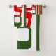 Este conjunto de toalhas tem uma design de Natal moderna do século médio de linhas e retângulos em tons retrorados de vermelho e verde.