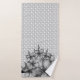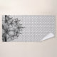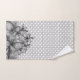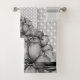 A característica de toalhas do banho e de mão pintou lírios nas máscaras das cinzas com tendrils e as folhas mergulhadas sobre um cinzento e um branco verificaram o fundo. Sua escolha de exposições do texto em um roteiro branco bonito sobre uma banda horizontal semi-transparente na toalha de banho. O pano da lavagem tem listras em máscaras de variação das cinzas sobre um fundo verificado. Trabalhos de arte e design por Karlajkitty