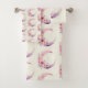 Conjunto de toalhas com uma ilustração encantadora apresentando uma lua crescente rosa e roxa suave. Lindas flores silvestres rosa e amarelo adornam este corpo celeste.