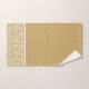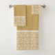 Este conjunto de toalhas de banho inclui e lava pano, toalha de mão e toalha de banho, que apresenta um padrão de rendas florais em ouro e branco com uma faixa branca que separa o padrão do fundo dourado. Você pode comprar este conjunto inteiro ou pode comprar os itens individualmente. Isto é para fazer o seu banheiro se destacar!