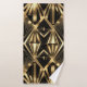 Transform your bathroom into an opulent retreat with this striking Art Deco matching towel set. The design features a bold, geometric pattern inspired by the Jazz Age, utilizing radiant sunburst motifs, elongated triangles, and diamond shapes. The pattern is rendered in a rich, metallic gold tone that contrasts sharply against a deep black background, creating a glamorous and sophisticated look.