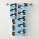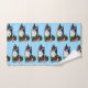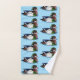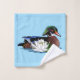 Pato de madeira na água com um lenço de água branco ao lado do pato num pano de fundo abandonado de azul