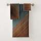 Set Of Bath Towels amenity e acessório de decoração em casa com design de trabalho de arte do Deserto Pintado do Sudoeste por TheFabricSeal no Zazzle. Esta bela ilustração gráfica digital apresenta uma falso superfície de madeira com escova de ar e listras horizontais pintadas por aquarelas com lindas cores inspiradas nos desertos do magnífico Sudoeste. Tons de paleta colorida de preto, marrom, burgundy, red, rust, terra cotta, tijolo, tan, areia, azul-turquesa e verde.