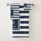 Um elegante conjunto náutico de toalhas de design, personalizado, com âncora e um padrão marinho, azul e branco, com o seu nome de barco fixado num quadrado marinho com bordos azuis. Projetado por Thisnotme©