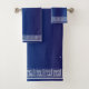 Toalha de banho com uma design de frita grega que você pode personalizar com qualquer texto de sua escolha. Se precisar de ajuda para personalizar, entre em contato conosco através do link desta página. Conjunto de toalhas frieze cinza azul-marinho