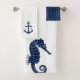 Marinho original e toalhas temáticos náuticas brancas do banheiro. Características ajustadas desta 3 partes um pano da lavagem do marinho com um teste padrão da âncora. A toalha de mão do meio caracteriza uma âncora do marinho com um ponto para seus primeiro e último monogramas conhecidos em cada lado. Finalmente a toalha de banho do cano principal caracteriza uma ilustração colorida marinho do cavalo marinho do estilo do vintage nas bordas mais baixas inferiores da toalha.