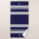 Este conjunto de toalhas de banheira apresenta um design de ponta em azul marinho e cinza, com a toalha de banho com riscas brancas de destaque. No fundo da grande toalha de banho está o seu monograma, também em branco. A toalha de mão menor e o pano de lavagem têm uma faixa de cinza coordenadora. Muito moderno, ousado e atraente!