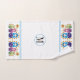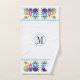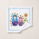 Matryoshka bonecas russas e girassóis, design personalizado com um padrão colorido de bonecos de arte folclórica russa Matryoshka ou Matroska em roxo azul, verde e rosa com flores e ao redor delas girassóis. A toalha da mão inclui as bordas das bonecas com duas linhas azuis e o seu monograma enquanto o pano de lavagem tem uma boneca no centro com uma borda desfocada à volta.
