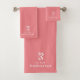 Um belo conjunto de toalhas de banheiro feminino cor-de-rosa que podem ser personalizadas para seu nome e inicial. O design usa uma fonte de tipografia infantil para o nome e o nome iniciais. Decorar o banheiro do seu filho com este belo conjunto.
